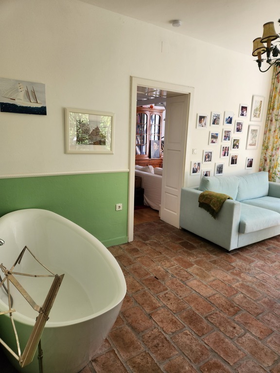 Our house was built a houndred years later for the young family members to have balls. It is very bright and friendly and one can see that the 2000m2 garden was a darling since 150 years. It was totally renovated and enlarged by my husbands parents and is now 280m2, with two bathrooms two living rooms, a veranda and 3 bedrooms.