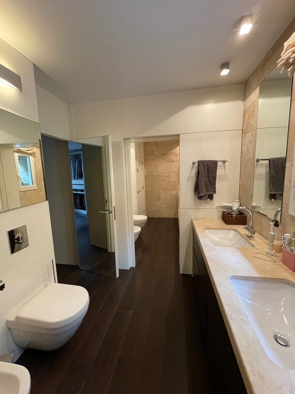 Downstairs: 3 bedrooms, all of them with exit to the garden. The master room is huge and has a 180x200 king size bed with air aconditioning and a ceiling fun. Jan's bedroom has a 135x200 bed and also with a ceiling fun and a small toilet inside. The last room has a single 110x190 single sofa bed for guest. In this floor there are 2 complete bathrooms one with a bath and the other with 2 showers. We also have a room/study area.