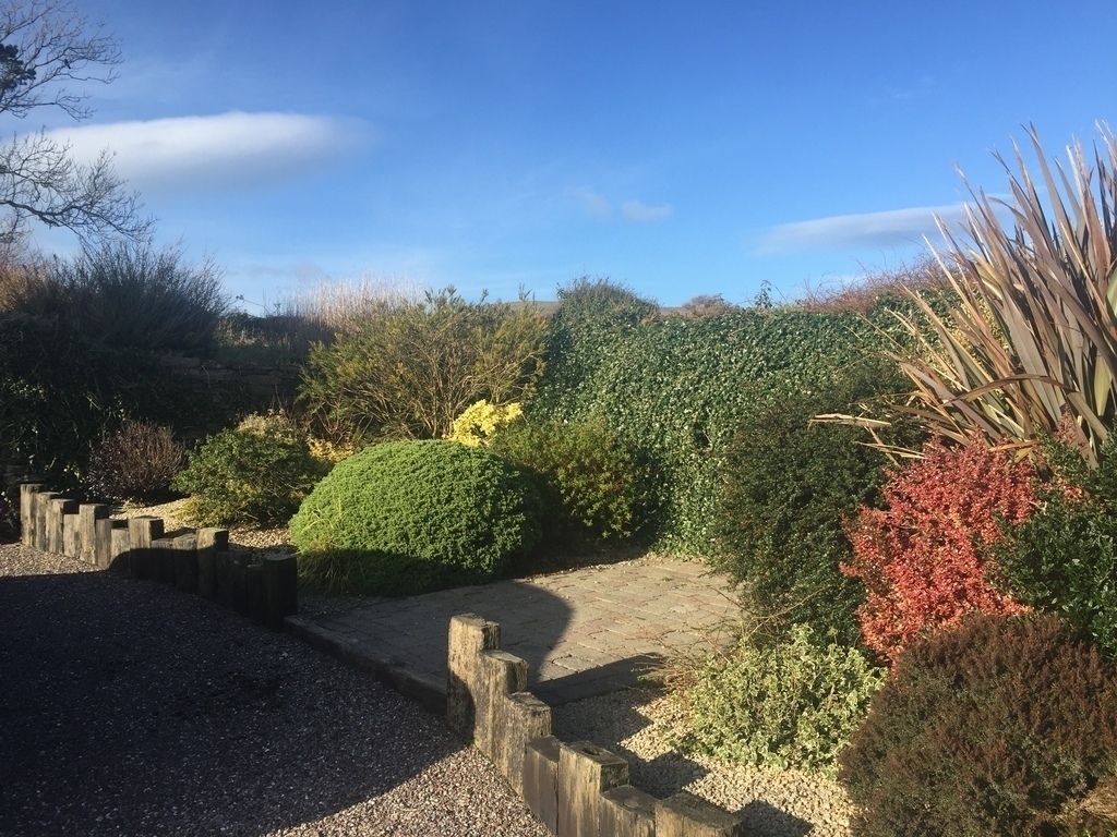 Large garden with porch area.