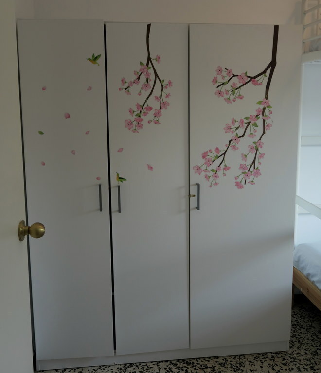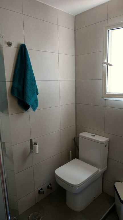 The bathroom has a walk in shower and a toilet. The master bedroom(double bed 150cm) has also a terras overlooking the common gardens from the neighbourhood. We can provide a carry cot. The other bedroom consists out of a bunk bed (2x 90cm).