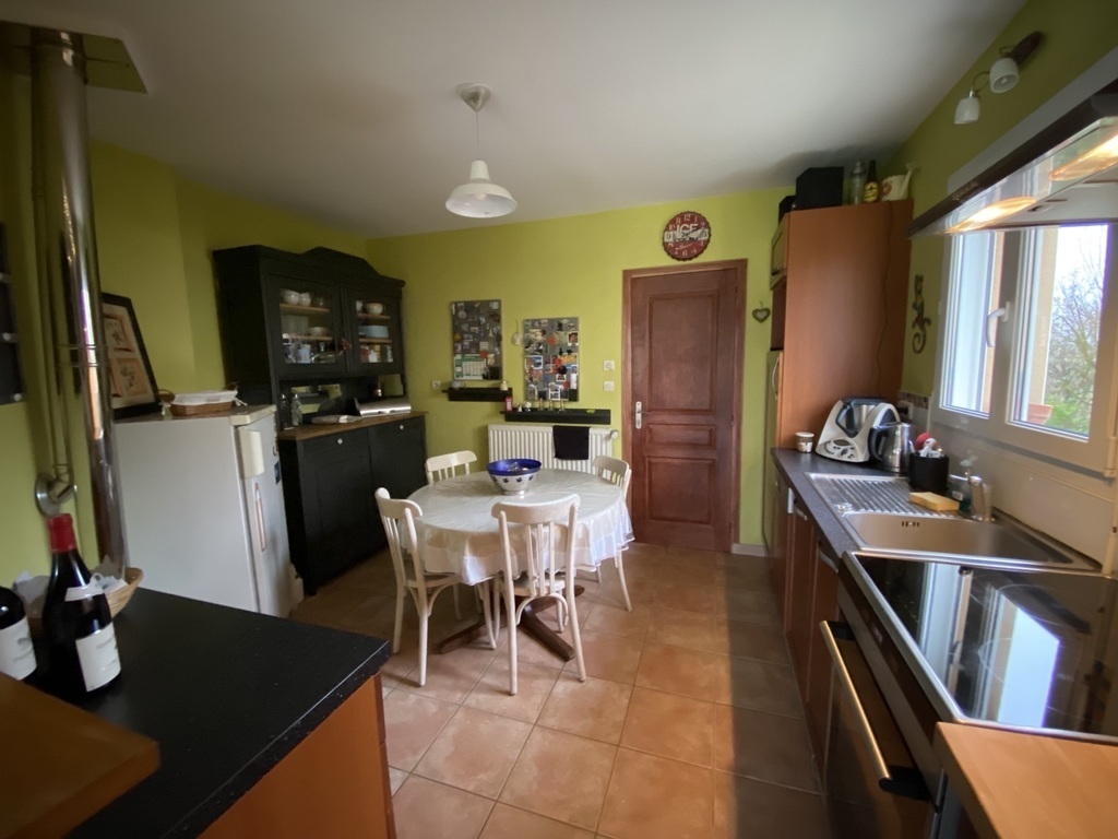 Au Rez-de-chaussée : 1 salon avec poêle à pellets et 1 salle à manger, 1 cuisine équipée (plaque de cuisson, four, micro-ondes, lave-vaisselle, frigo, congélateur), 1 chambre d’amis avec un canapé convertible 2 places, 1 salle de bain avec douche et baignoire, 1 wc et le garage.