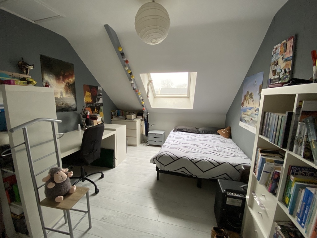 A l’étage : 3 chambres (3 avec lit double), 1wc, 1 salle de bain avec douche et un bureau (avec instruments de musique dont un piano numérique). Le grenier peut aussi être equipé en chambre.