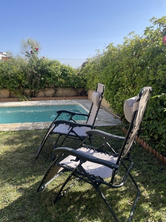 Nuestra casa dispone de un dormitorio principal con cama doble y baño privado y dos dormitorios adicionales con cama individual y espacios de trabajo.En esta planta también hay otro baño. El salón, amplio y acogedor. La cocina, también espaciosa, está equipada para cocinar y compartir sin prisas. En el garaje se ha habilitado un gimnasio, ideal para mantenerse en forma sin salir de casa. El jardín tiene piscina y porche para disfrutar del buen clima durante la mayor parte del año.