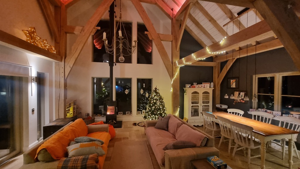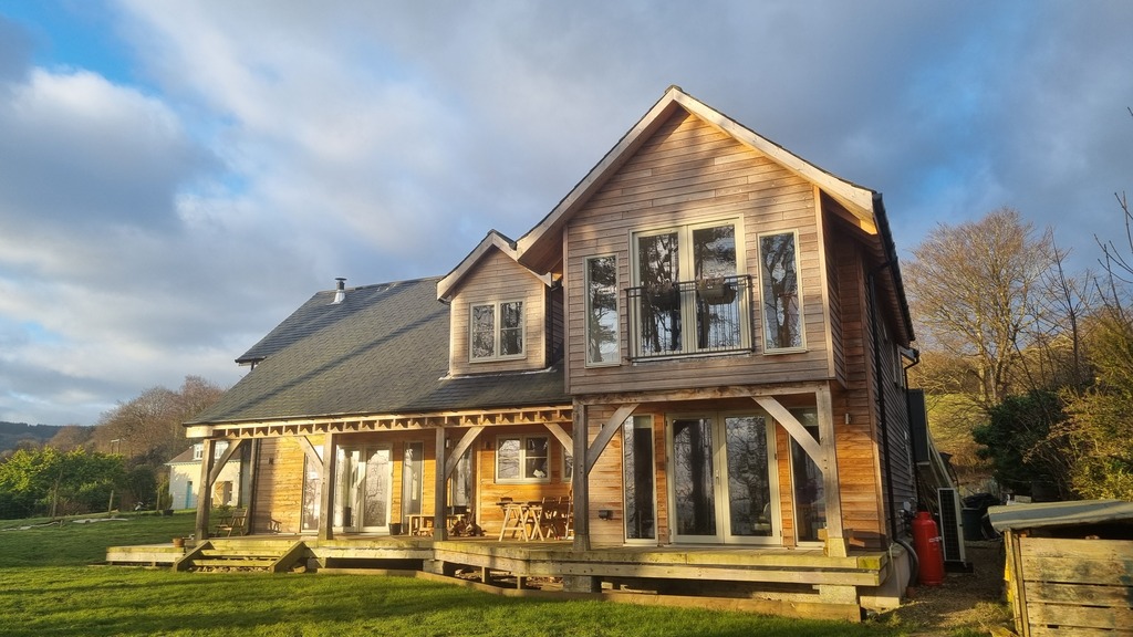 We live in the lovely village of Whiting Bay on the Isle of Arran. Our home is an architect-designed self build which we moved into in 2022. Our location is in the heart of the village and only a few minutes walk from the local beach, but sits in a small group of houses accessed from a private driveway. The house itself has four bedrooms and three bathrooms. The centrepiece is a striking open-plan living room and kitchen area with a vaulted ceiling with a green oak frame. There is a cosy log-burner stove for when the nights are cooler, albeit the house is very well insulated.